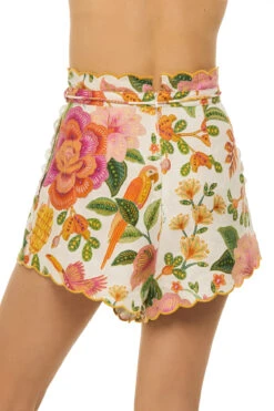 Alizee mini skirt features a floral print with a tiered ruffle skirt and offers a smocked waistband and built-in shorts.