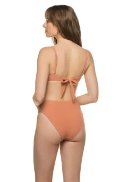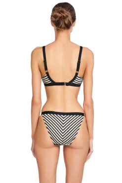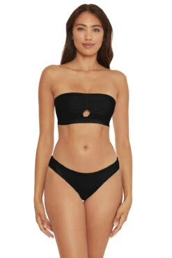 Amber bralette bikini top features a ribbed, stripe fabric with bust darts that create a flattering straight neck silhouette and includes removable cups. Offers wide shoulder straps with a pull over silhouette.