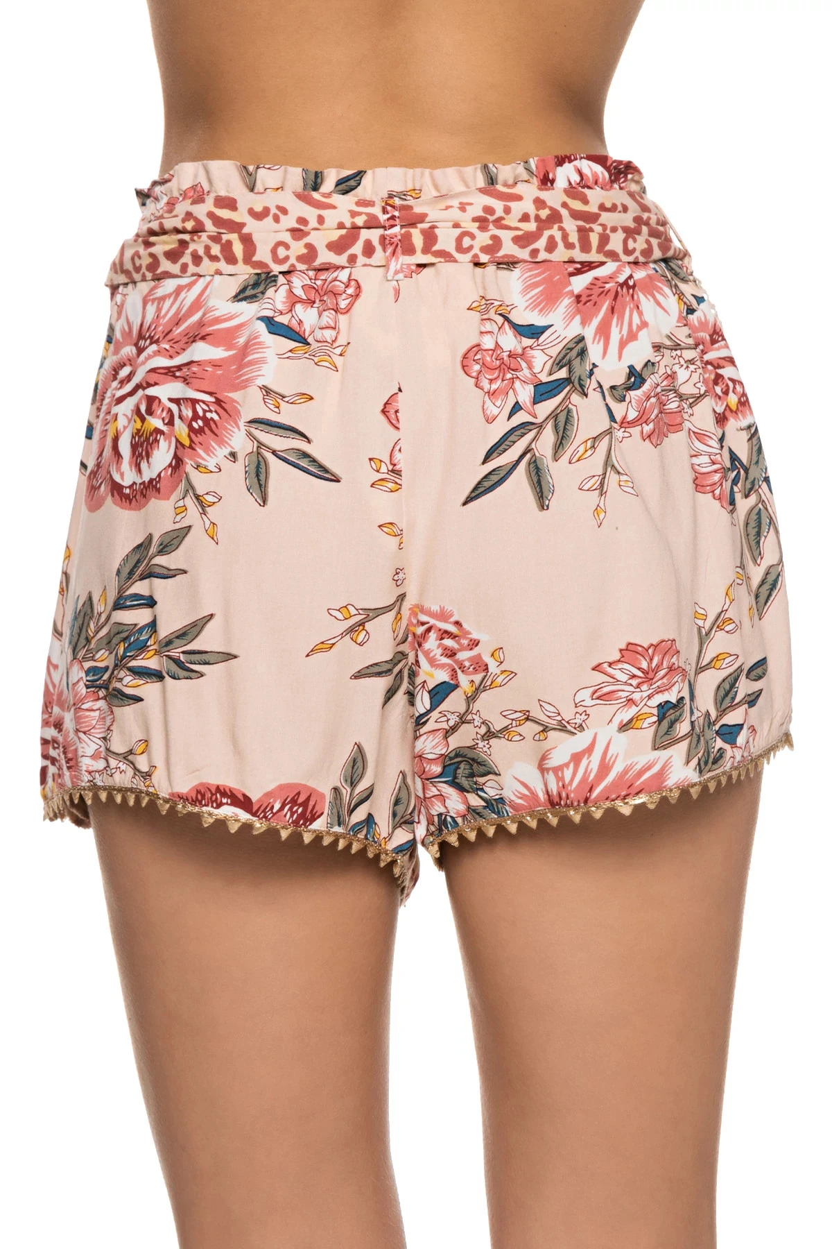 Belle shorts feature a mix animal/floral print with a fabric belt and detailed hem.