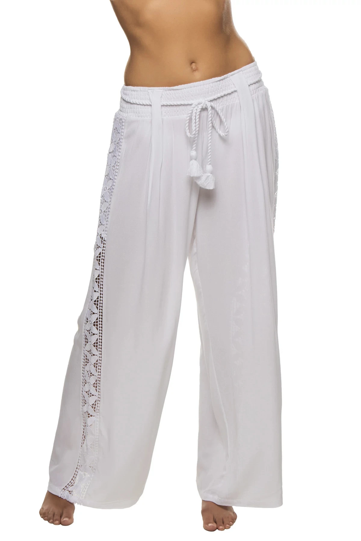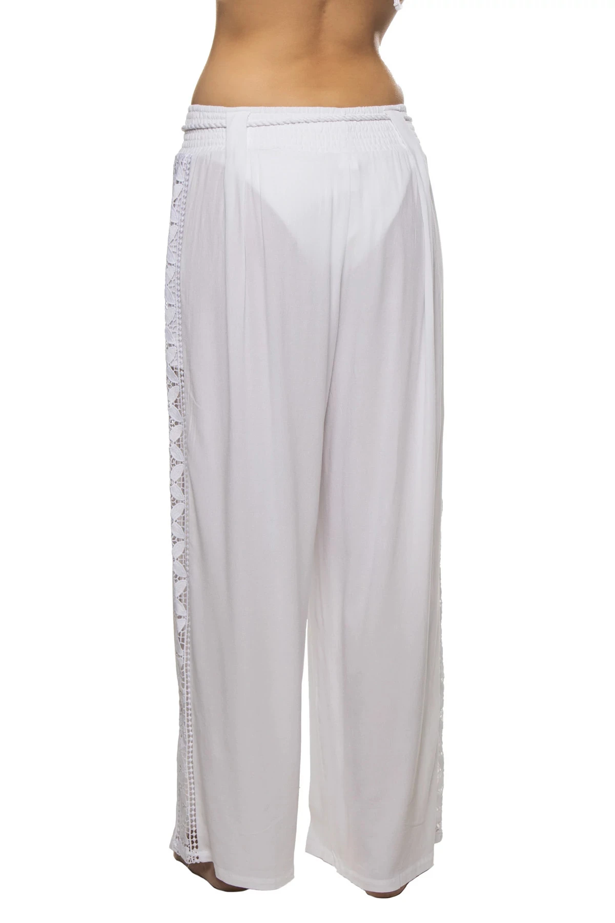 Coastal pants features a crochet detailed side panel and offers a smocked waistband with a waist tie.