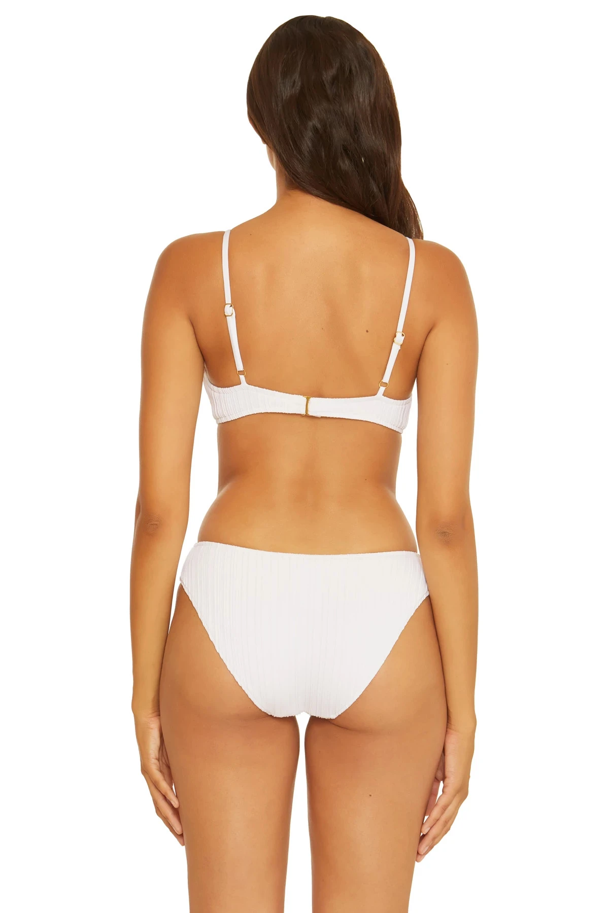Emory bralette bikini top features a ribbed texture with a strappy cut-out center and square gold buckle accents. Offers supportive underwire, removable soft cups, adjustable lingerie straps, and an adjustable hook back.