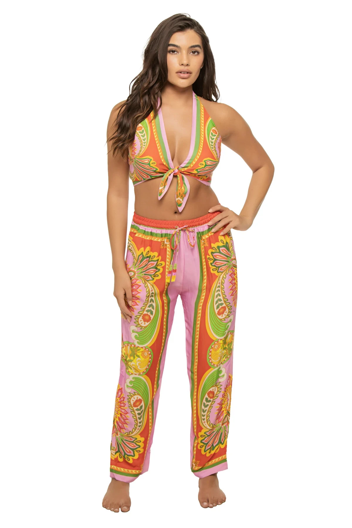 Beach toucans top features a scarf like fabric with a halter strap and tie front.