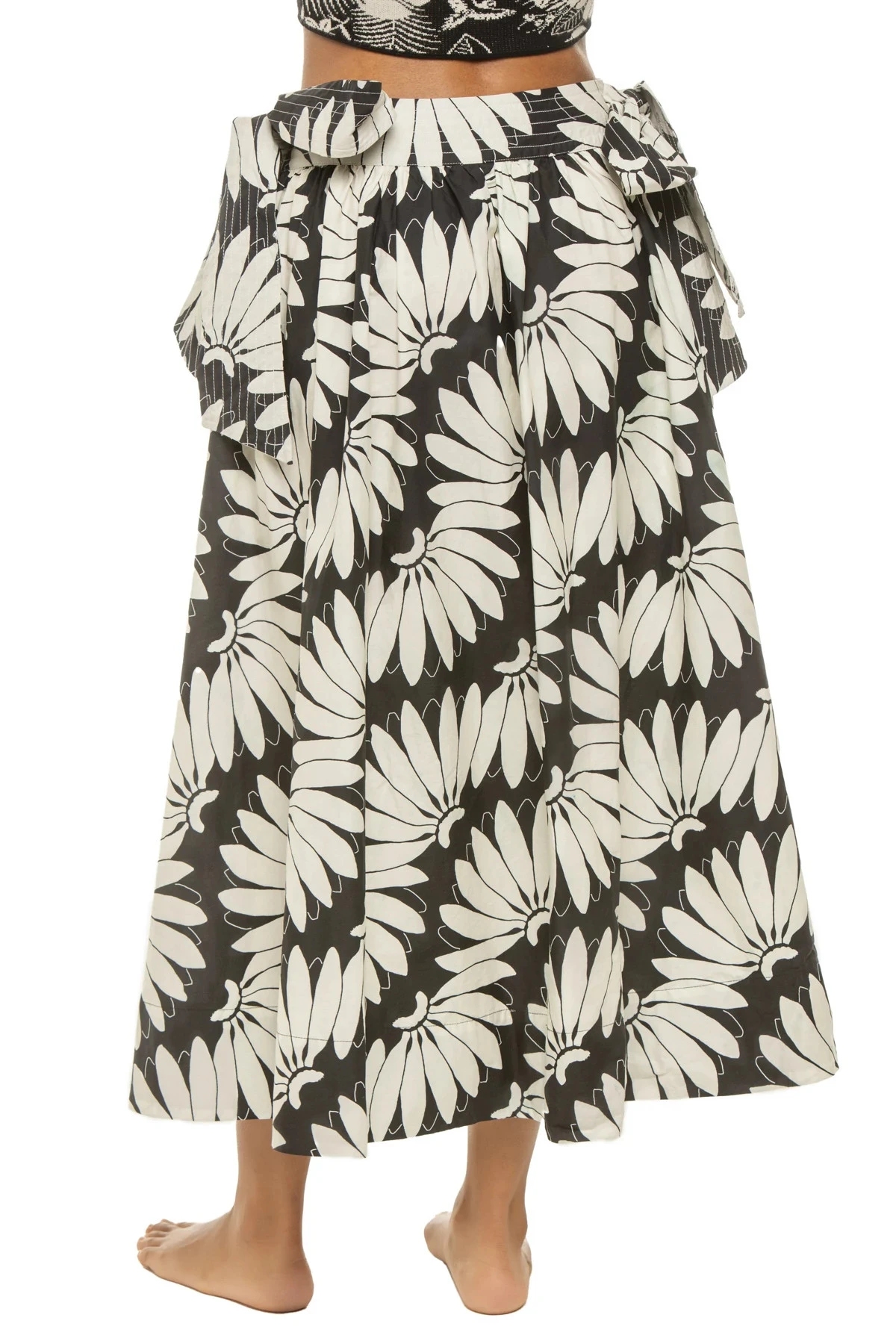 Copabanana midi skirt features a neutral banana print with a wide waistband and tie side details. Offers side zipper closure.
