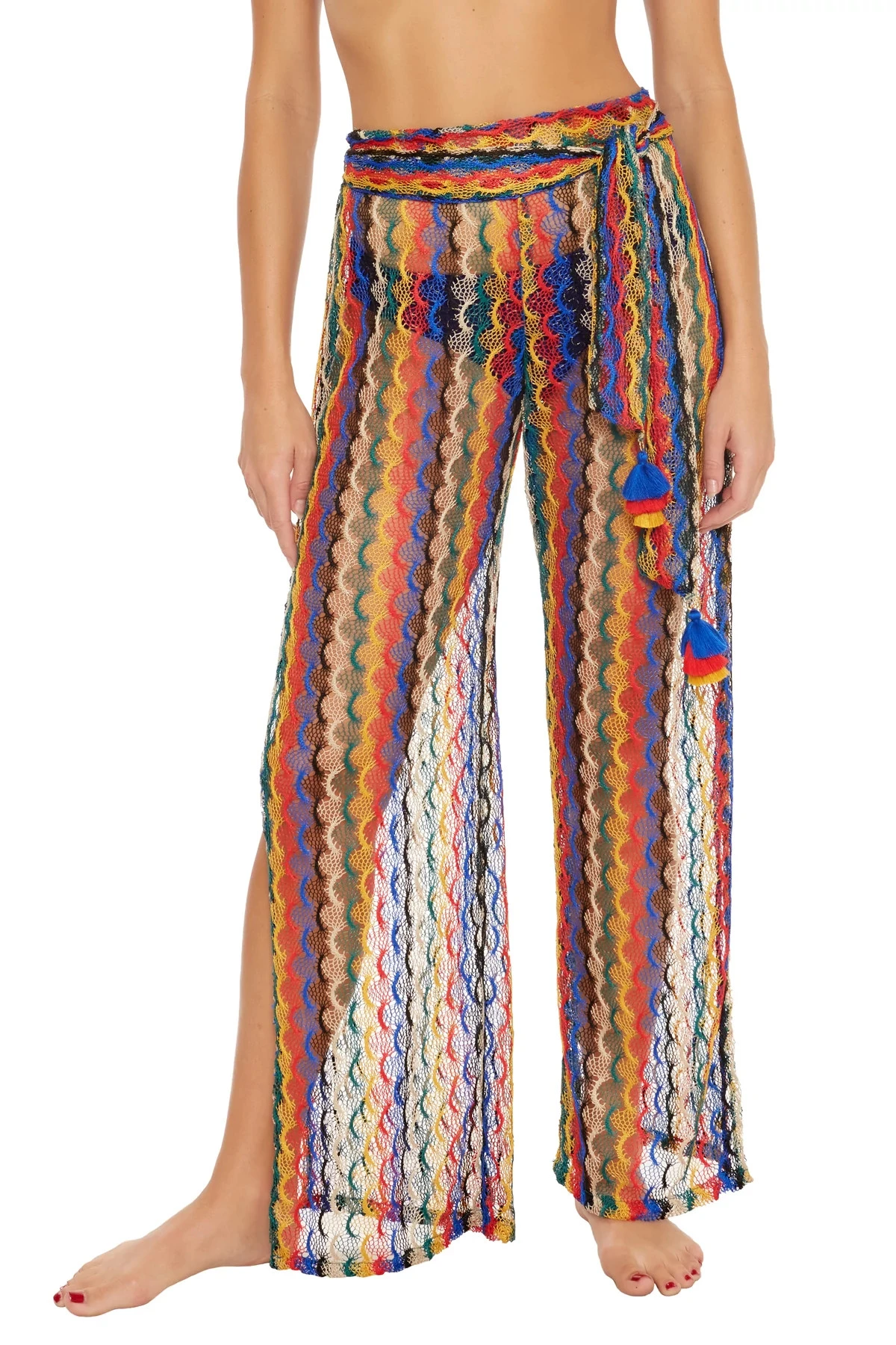 Iseree crochet pants feature side slits and offer a fabric self tie belt at waist with colorful tassel ends.
