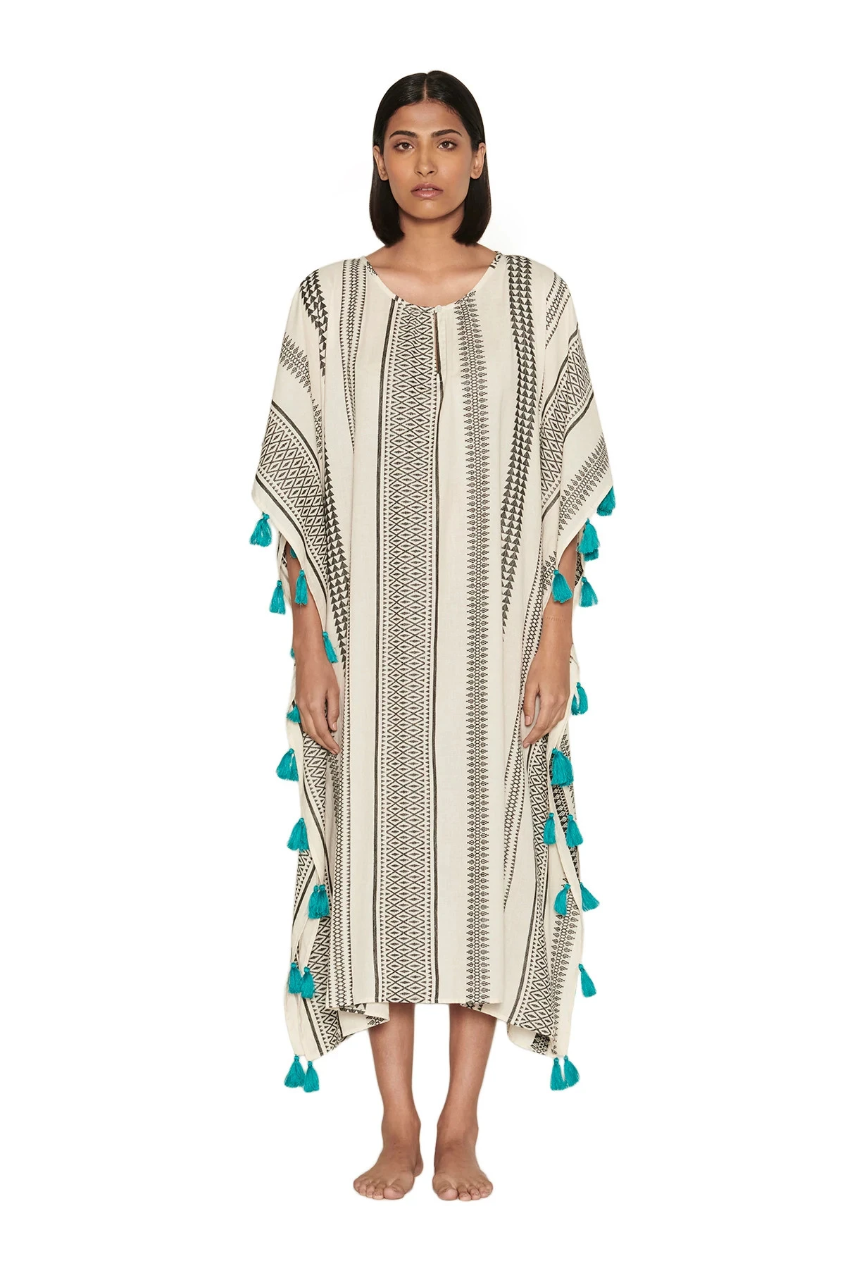 Jamaica caftan features contrast tassel trim and a scoop split neckline that offers a button closure.