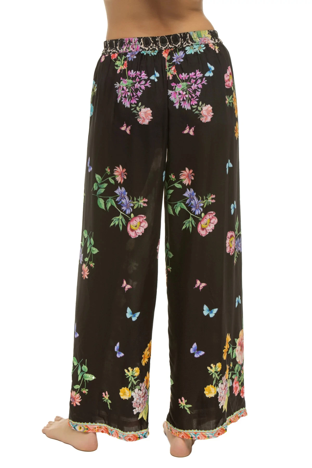 Pants feature an elegant floral print and offers a tie front with wrap over detailing and a wide leg.