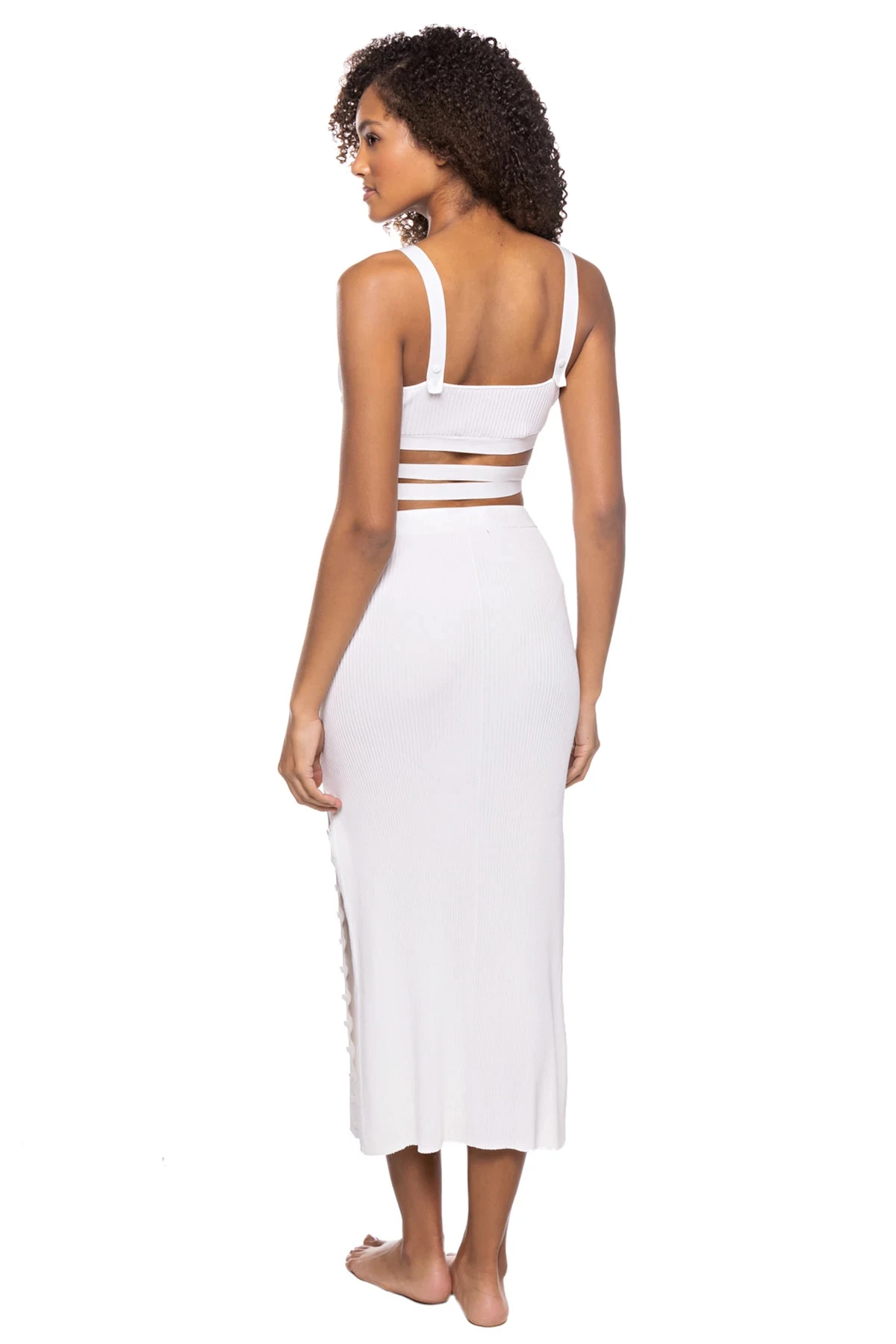 The Myka is a cropped, rib knit that features wrap around ties at waist and offers adjustable button straps.