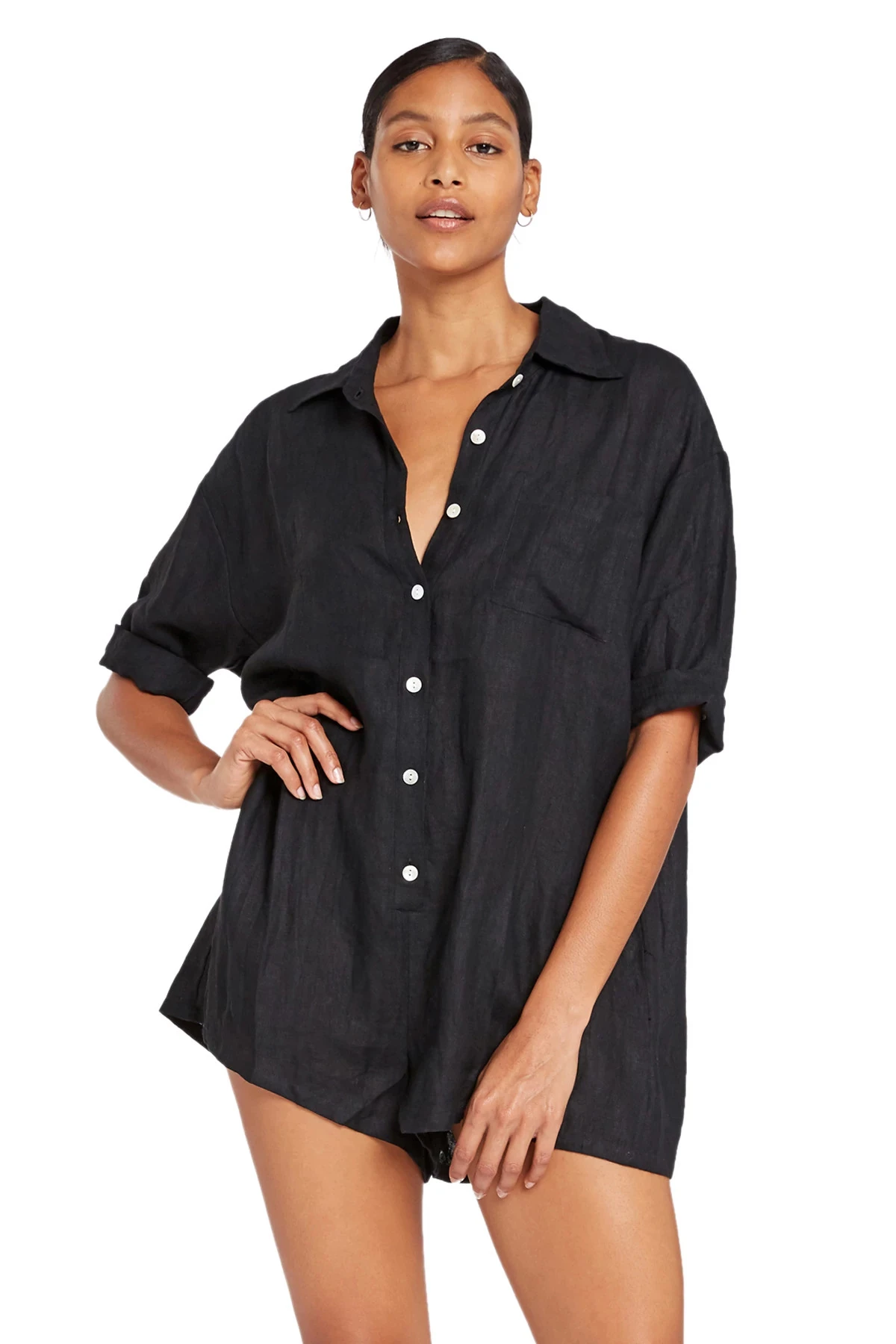 Playa romper offers an oversized fit shell buttons and a removable self tie belt.