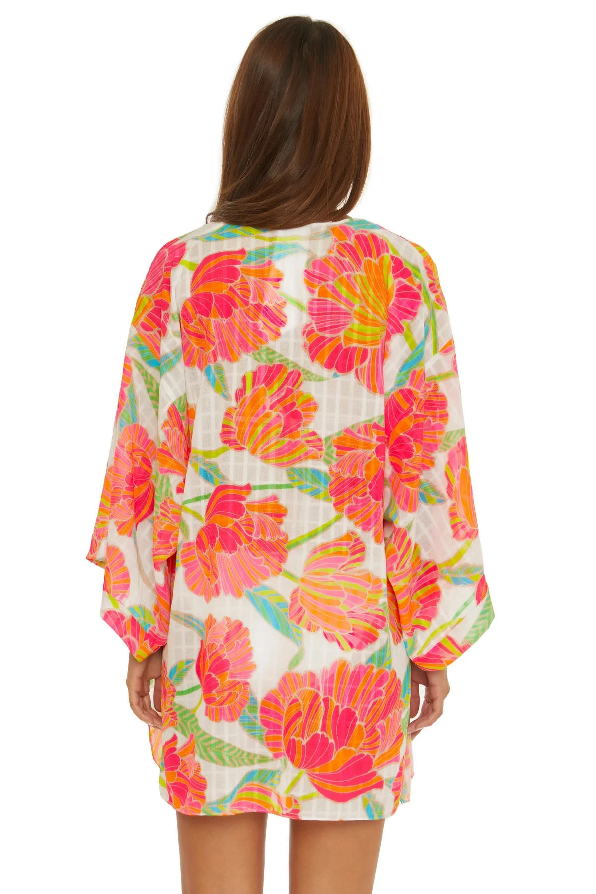 Poppy beach shirt features a bright floral print and offers long sleeves with an open front that can also be tied at waist.