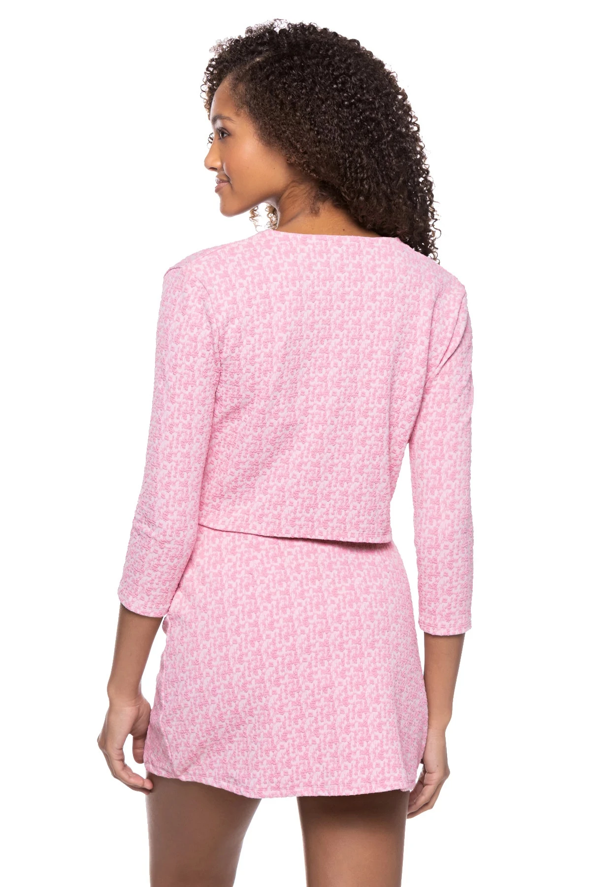 The Sasha Jacket is a swim jacket, featuring a cropped body with 3/4 sleeves and bespoke buttons.