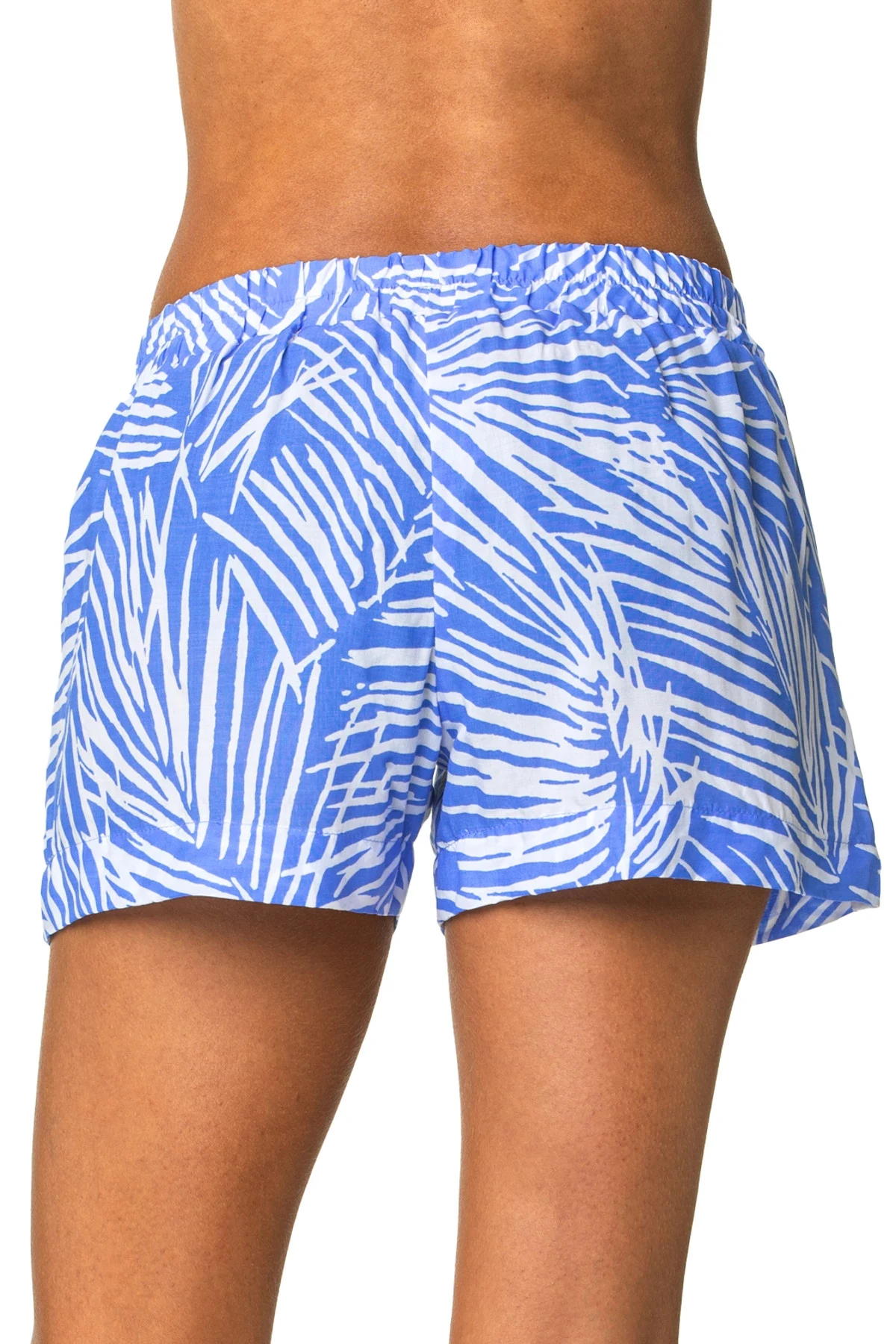 Seaside shorts feature a palm print and front pockets and offers ties at waist with an elastic back.