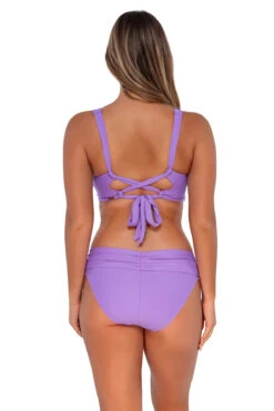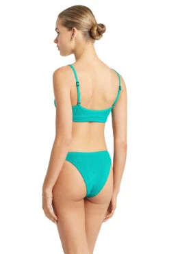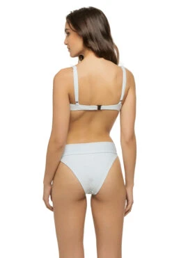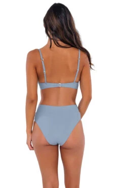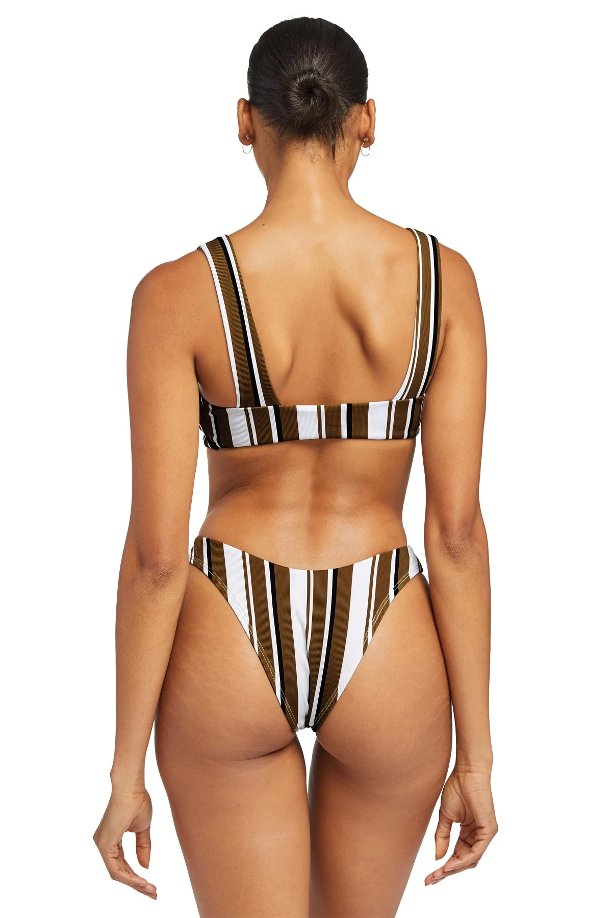 Skylar bralette bikini top features a ribbed fabrication with a fully lined bra and upcycled gold ring center and offers wide supportive straps.