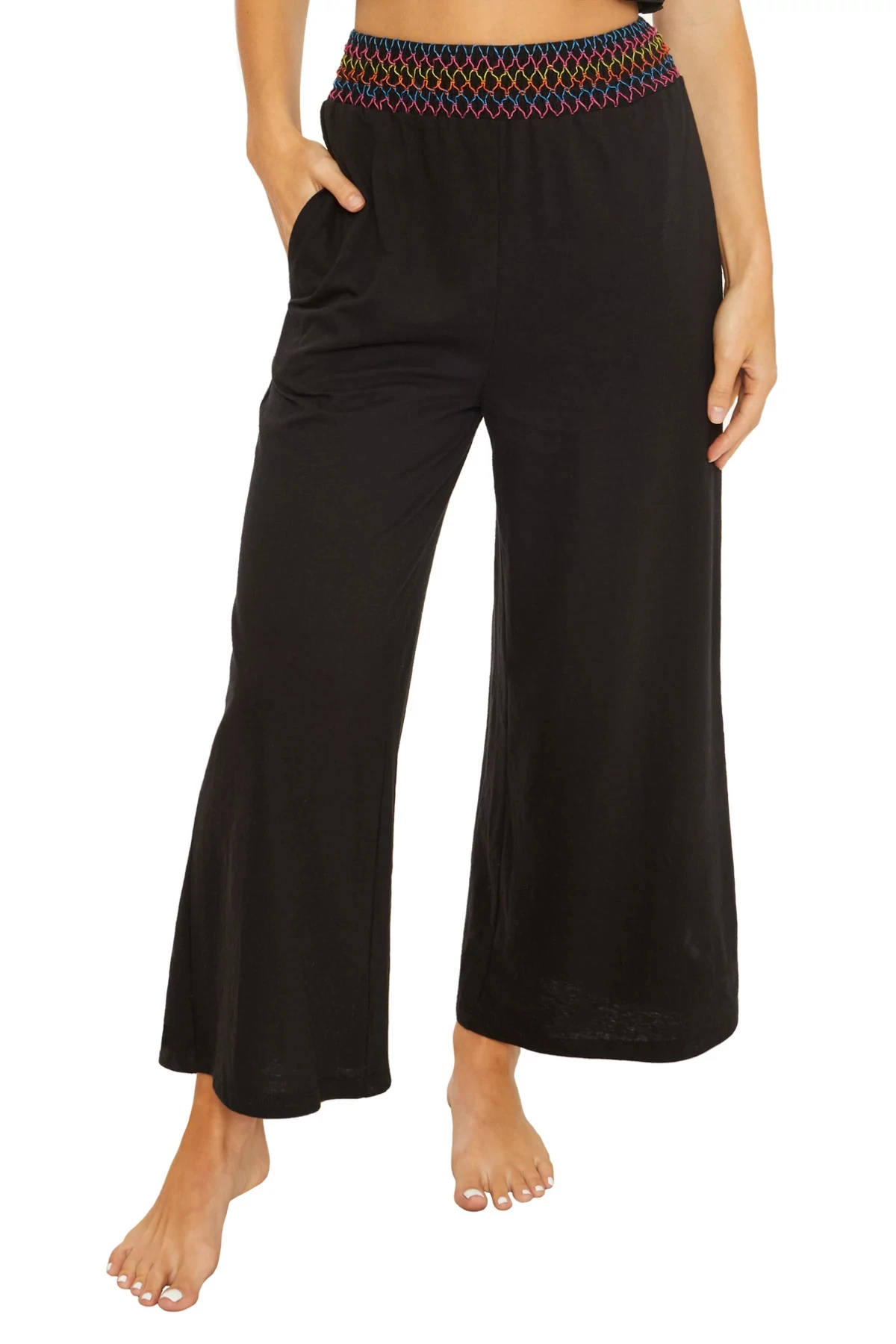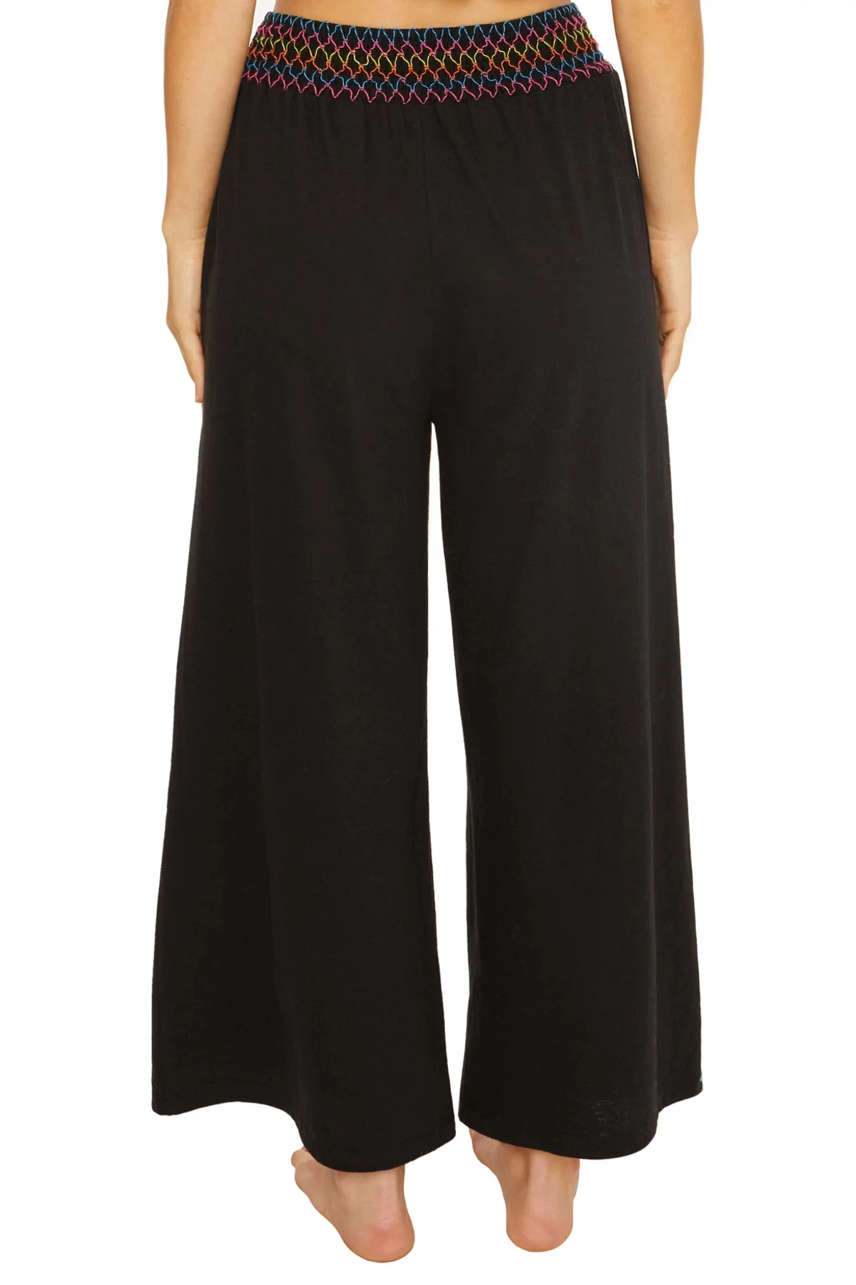 Sunset pants features a smocked waistband with colorful threading and front pockets.