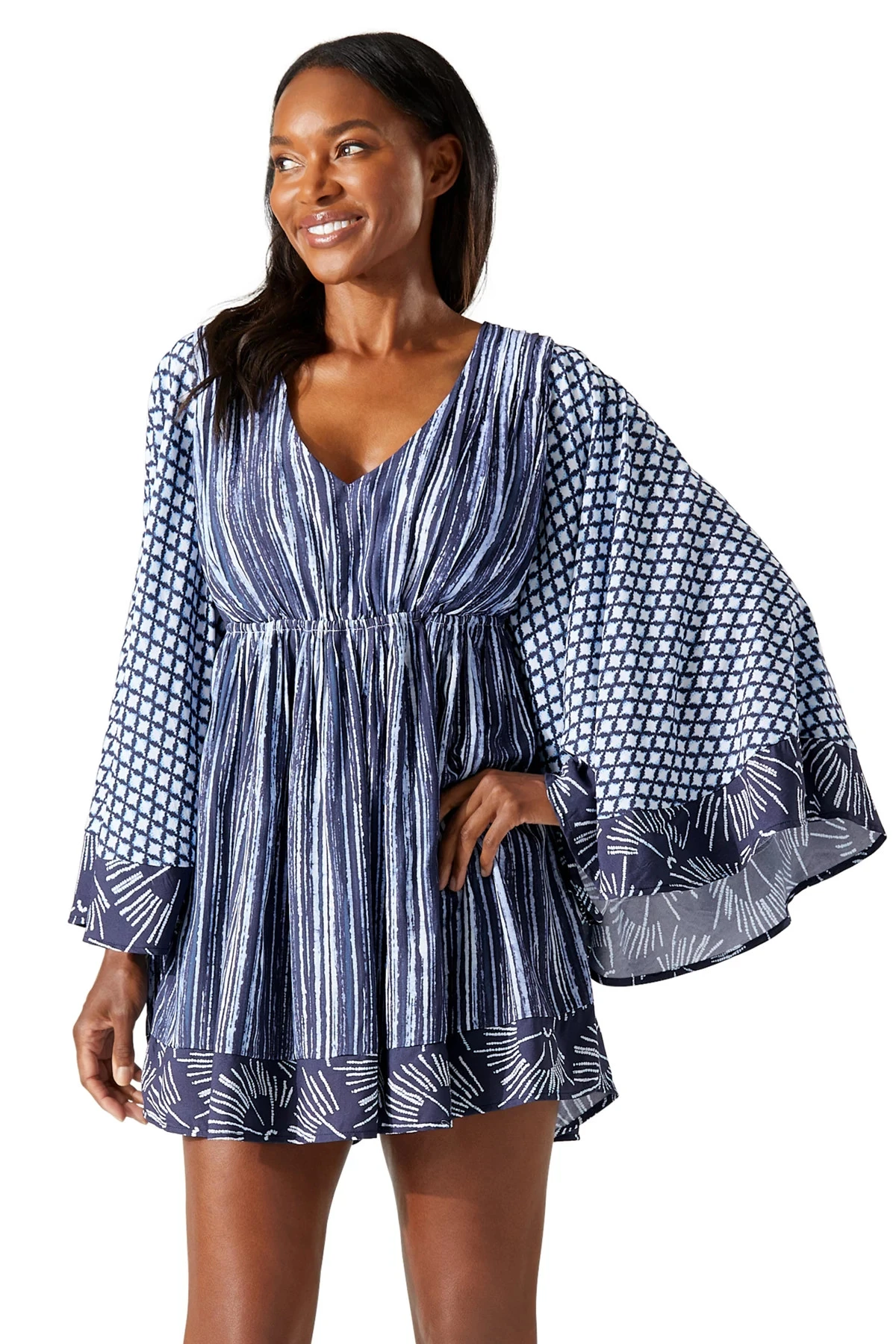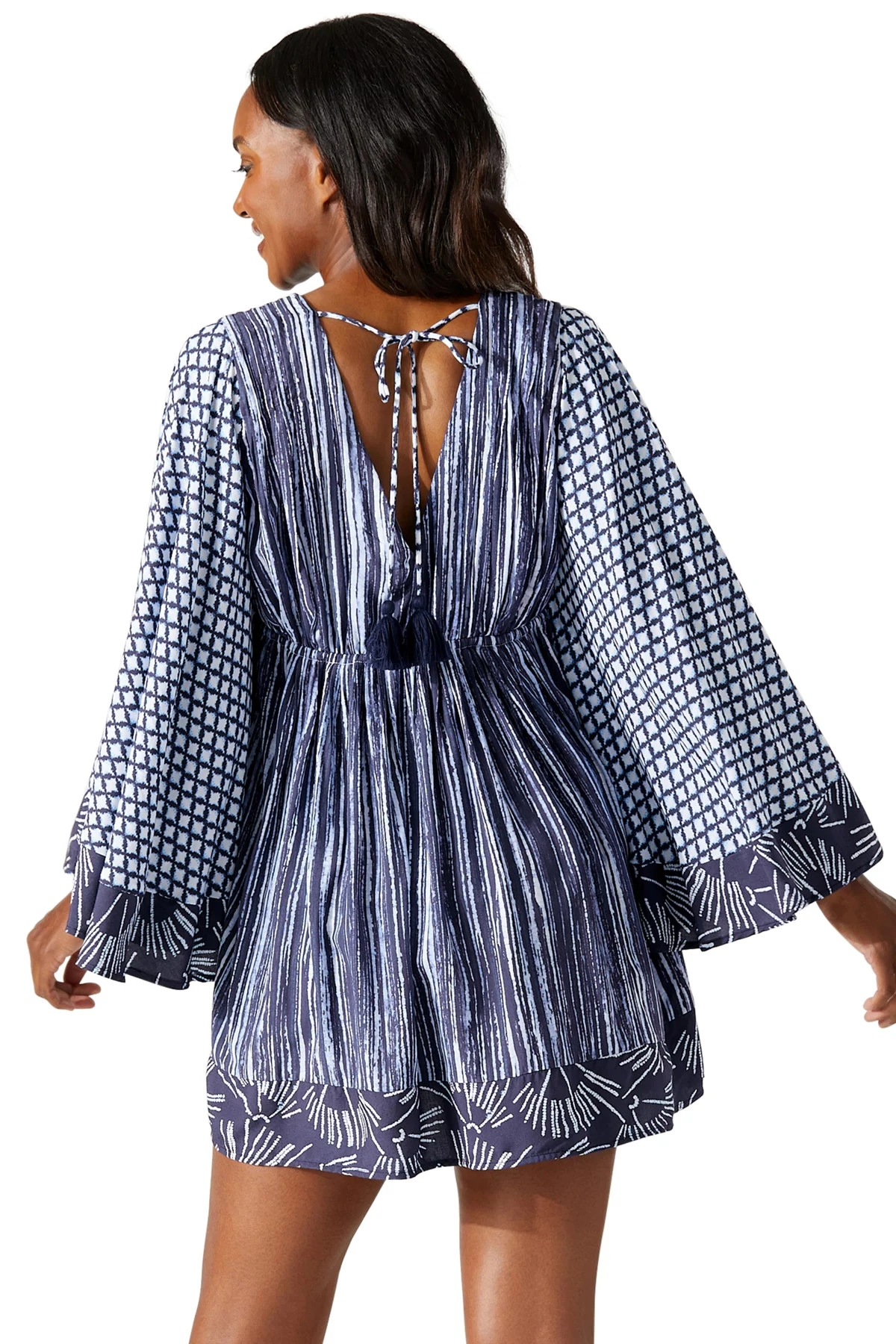Pintuck tunic features a double v-neck and long butterfly sleeves and offers an elastic waist and back tassel neck ties.