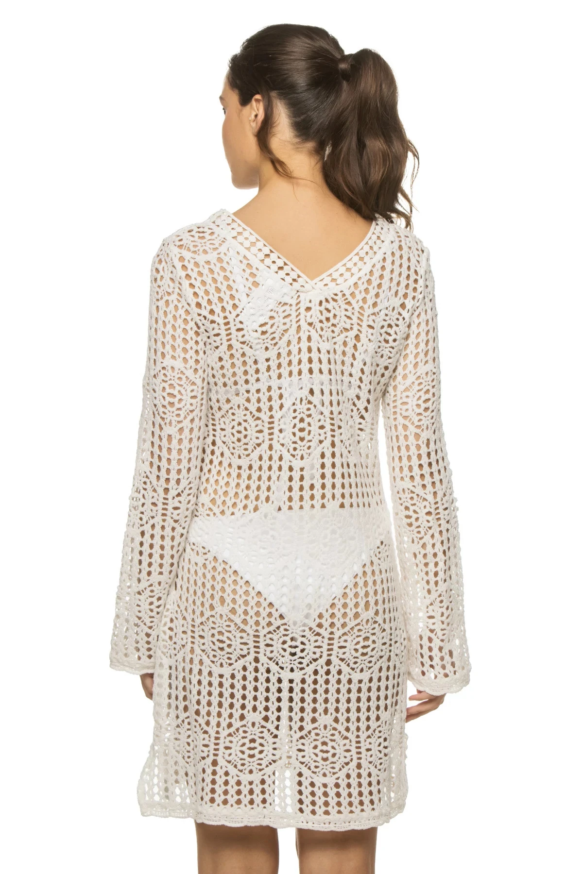 Waverly tunic features a detailed crochet fabric with a v-neckline and bell sleeves.